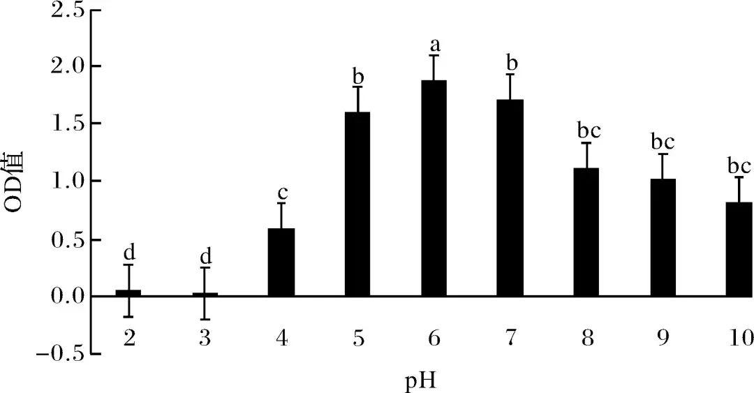 由圖3可知,pH 2~3的環(huán)境中該菌幾乎不生長(zhǎng),pH=4時(shí)增長(zhǎng)較為顯著,此時(shí)該菌增長(zhǎng)緩慢;在堿性環(huán)境中(pH=8、9、10)該菌OD值呈下降趨勢(shì),pH=6時(shí)該菌長(zhǎng)勢(shì)最好,為該菌最適生長(zhǎng)的pH環(huán)境。