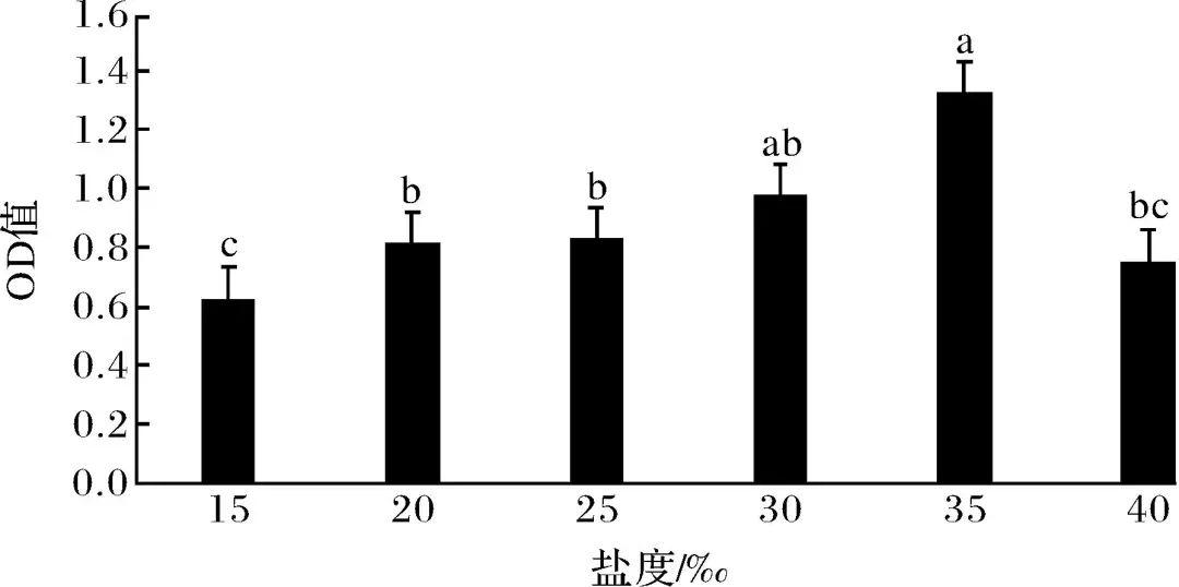 由圖2可知,在15‰與40‰的鹽度下、20‰~30‰鹽度環(huán)境下該菌增長(zhǎng)變化差異不顯著,35‰鹽度環(huán)境下較15‰、20‰、25‰和40‰組增長(zhǎng)差異顯著,為最適的增長(zhǎng)鹽度。