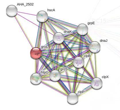通過(guò)ExPASy-ProtParam tool分析工具進(jìn)行分析,該蛋白氨基酸數(shù)為544,分子質(zhì)量為57 194.87,理論pI為4.87。其帶負(fù)電荷的殘基總數(shù)(Asp+Glu)為80,該蛋白為穩(wěn)定蛋白,其不穩(wěn)定指數(shù)為29.31,帶正電荷的殘基總數(shù)(Arg+Lys)為62;脂肪指數(shù)為98.29,親水性總平均值(GRAVY)為0.014。通過(guò)STRING數(shù)據(jù)庫(kù)預(yù)測(cè)其與相關(guān)蛋白的相互關(guān)聯(lián),圖6是證據(jù)視圖,蛋白質(zhì)CH60_AERHH在圖中顯示為groL。