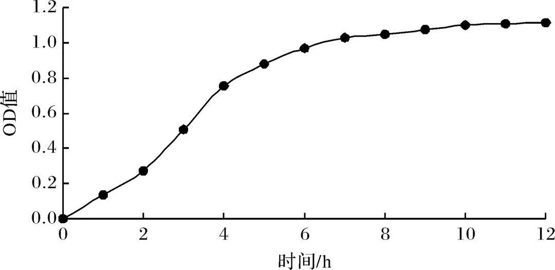 通過(guò)生長(zhǎng)曲線(圖1)可以看出,3~6 h為本菌的對(duì)數(shù)生長(zhǎng)期,6 h后生長(zhǎng)趨于平穩(wěn)達(dá)到穩(wěn)定期。