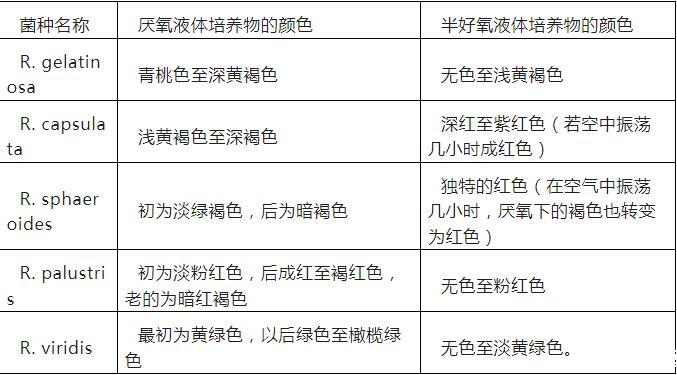 表一、紅螺菌科紅假單孢菌屬中的幾個(gè)種在厭氧條件與半好氧條件下液體培養(yǎng)物的顏色比較