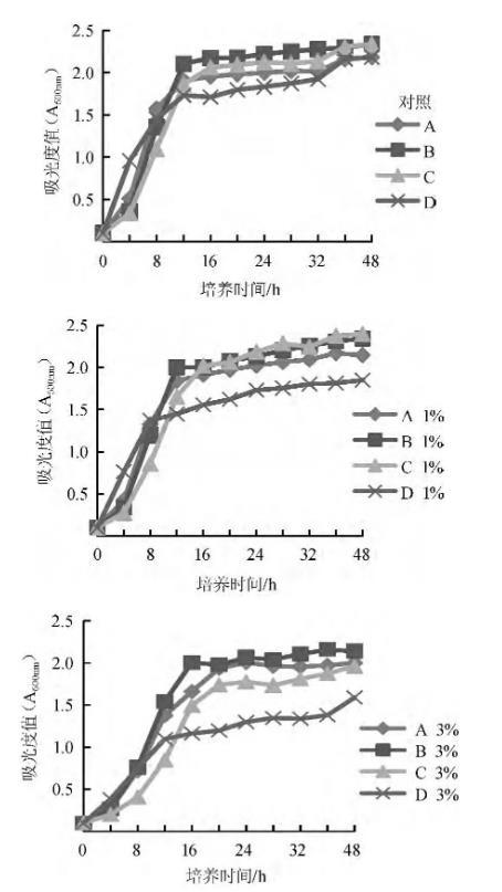 總的來說,鹽含量為0~3%的情況下,為4種高糖酵母較適宜的生長環(huán)境,且易于達(dá)到一個(gè)平穩(wěn)生長的趨勢。