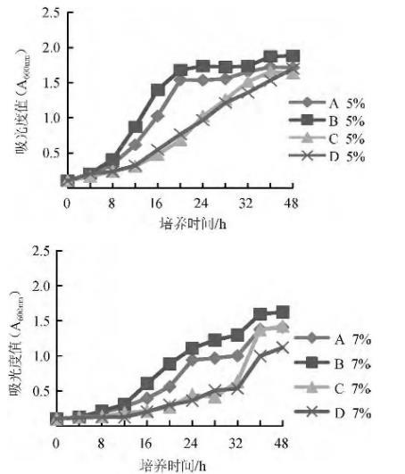 根據(jù)低糖酵母耐鹽性生長曲線(見圖1)分析可知,在不含鹽和鹽含量為1%時(shí),4種低糖酵母的生長趨勢差不多。而在鹽含量為3%時(shí),表現(xiàn)為D低糖酵母的生長趨勢較緩慢。在含量為5%~7%時(shí),A、B兩種低糖酵母的生長趨勢優(yōu)于C和D兩種低糖酵母。