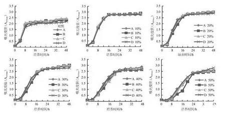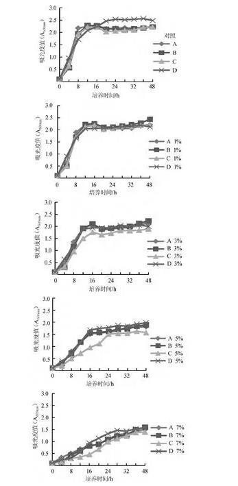 低糖酵母粉于空白YPD培養(yǎng)基中30℃過夜培養(yǎng)后,以菌液A600nm=0.1時(shí)的濃度接種于各低糖梯度的液體培養(yǎng)基中,置于30℃、200 r/min的搖床中進(jìn)行觀察培養(yǎng),以不添加葡萄糖的培養(yǎng)基作為對照。每隔4 h測定其在波長600 nm條件下的吸光度值,直至48 h,觀察酵母菌種在各鹽含量下的生長情況。