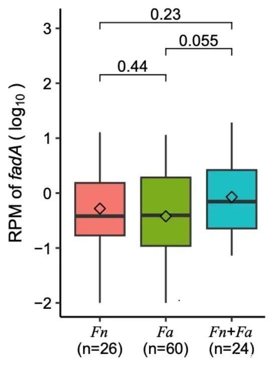 具核梭桿菌(Fusobacterium nucleatum,Fn)是結(jié)直腸癌與腸道微生物研究中熱度最高的一個細菌。研究者利用高深度宏基因組數(shù)據(jù),在菌株層面對Fn及其近源物種動物梭桿菌(Fusobacterium animalis,Fa)進行了深度解析,發(fā)現(xiàn)在結(jié)直腸癌患者的糞便中Fa的出現(xiàn)率和相對豐度都高于Fn。既往研究表明,F(xiàn)n可以通過粘附蛋白附著到宿主細胞,引起DNA損傷。fadA基因是粘附蛋白的一個編碼基因,被稱為毒力因子。在僅含有Fn或Fa的CRC患者中,研究者發(fā)現(xiàn)fadA基因的含量沒有差異,表明Fn和Fa菌株很可能都攜帶有fadA毒力因子。