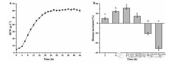 谷氨酸棒狀桿菌的生長(zhǎng)曲線如圖a所示,作為識(shí)別不同生長(zhǎng)期的基線數(shù)據(jù)。培養(yǎng)前4h為延滯期,培養(yǎng)后4h至20h為指數(shù)期,培養(yǎng)20h后進(jìn)入穩(wěn)定期。在進(jìn)行發(fā)酵的同時(shí)應(yīng)用超聲波對(duì)發(fā)酵液進(jìn)行處理,超聲波處理時(shí)長(zhǎng)分別為2、4、8、16、20和24h,超聲波處理對(duì)谷氨酸棒狀桿菌不同生長(zhǎng)階段的影響如圖b所示。在滯后期和指數(shù)期開始時(shí),生物量顯著增加,在8h時(shí),超聲波處理的谷氨酸棒狀桿菌的生長(zhǎng)比對(duì)照增加了15.6%。超聲處理在指數(shù)后期和穩(wěn)定期會(huì)導(dǎo)致生物量顯著下降。超聲波對(duì)微生物有雙重作用:對(duì)細(xì)胞生長(zhǎng)的積極影響是可以提高酶的活性和營(yíng)養(yǎng)物質(zhì)的傳質(zhì)速率,而消極影響是應(yīng)用超聲波所產(chǎn)生的剪切力和自由基。不同生長(zhǎng)階段的細(xì)胞對(duì)超聲波的耐受性不同。因此,后續(xù)實(shí)驗(yàn)選擇以8h為指標(biāo)進(jìn)行超聲處理。