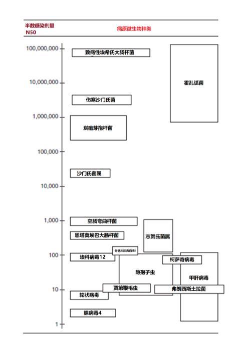 水中可能存在的病原微生物包括尺寸極小的病毒(如腸病毒)、尺寸居中的有害細(xì)菌(如霍亂菌)及尺寸較大的原后生動物(如隱孢子蟲和賈第鞭毛蟲,俗稱“兩蟲”)等。不同病原微生物的致病性不同(圖1)。所謂致病性或致病能力,即引起腹瀉、嘔吐、發(fā)燒等急性疾病時所攝入的病原微生物的數(shù)目。一般來說,病毒的致病性最強(qiáng),如腺病毒、輪狀病毒和甲肝病毒,攝入數(shù)個或數(shù)十個病毒即可引發(fā)急性疾病?!皟上x”的致病性也很強(qiáng),稍弱于上述幾種病毒。而多數(shù)病原菌,如沙門氏菌、大腸桿菌的致病性則稍弱。實(shí)際上,水中的大多數(shù)細(xì)菌對人是無害的。