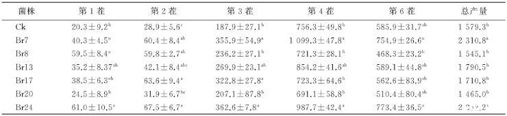 測(cè)定不同菌液對(duì)扁穗雀麥產(chǎn)量的促生效果發(fā)現(xiàn)菌液的促生效應(yīng)主要表現(xiàn)在植物生長(zhǎng)早期,盡管每個(gè)菌株都有促生效果,但增加幅度與持續(xù)時(shí)間差異較大。第1茬與第2茬測(cè)產(chǎn)時(shí),除Br13與Br20外,所有的菌液都對(duì)產(chǎn)量有顯著促進(jìn)作用(P<0.05),第3茬測(cè)產(chǎn)時(shí)發(fā)現(xiàn)只有施用Br7,Br17與Br24的植株產(chǎn)量顯著高于對(duì)照(P<0.05),Br8,Br13與Br20差異不顯著。第4茬與第5茬產(chǎn)量測(cè)定表明只有Br7與Br24兩種菌液對(duì)植物促生達(dá)顯著水平(P<0.05),然而其促生的增產(chǎn)幅度也比前3茬降低,其余菌液對(duì)植物促生效果與對(duì)照差異不顯著。5茬草總產(chǎn)量比較發(fā)現(xiàn),Br24與Br7對(duì)產(chǎn)量促進(jìn)效果最好,Br13和Br17次之,而B(niǎo)r8與Br20對(duì)產(chǎn)量促進(jìn)作用不明顯(表4)。