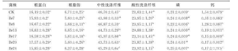 根據(jù)施用菌液的差異將每個(gè)處理下5次刈割的扁穗雀麥牧草混合均勻,測(cè)定其營(yíng)養(yǎng)品質(zhì)的變化。粗蛋白是決定牧草營(yíng)養(yǎng)品質(zhì)的重要指標(biāo)之一,不同溶磷菌液對(duì)扁穗雀麥粗蛋白含量影響較大,其中Br13與Br20顯著高于對(duì)照(P<0.05),Br8與Br17與對(duì)照相當(dāng),Br7與Br24略低于CK,但他們與對(duì)照間均沒(méi)有達(dá)到差異顯著水平(P>0.05)。施用溶磷菌液使扁穗雀麥粗脂肪的含量有下降的趨勢(shì),Br7、Br8、Br17與Br20與對(duì)照相比,粗脂肪含量下降16%(P<0.05),Br13與Br20沒(méi)有顯著變化(P>0.05)。中性洗滌纖維與酸性洗滌纖維是衡量牧草營(yíng)養(yǎng)價(jià)值的重要指標(biāo),并與動(dòng)物采食量以及消化率顯著相關(guān)。除Br8與Br17菌株外,施用其余菌液均能顯著降低扁穗雀麥的中性洗滌含量(P<0.05),但有增加酸性洗滌纖維含量的趨勢(shì),除了施用Br13菌液比對(duì)照略低外,其余各菌液都不同程度提高了扁穗雀麥酸性洗滌纖維的含量,但都未達(dá)到差異顯著(P>0.05)。使用溶磷菌液以后,扁穗雀麥的含磷量比對(duì)照高9.52%~19.05%(P<0.05)。然而施用溶磷菌液顯著降低了扁穗雀麥植株鈣含量,除Br8以外,其余各菌液降低值>70%(表5)。