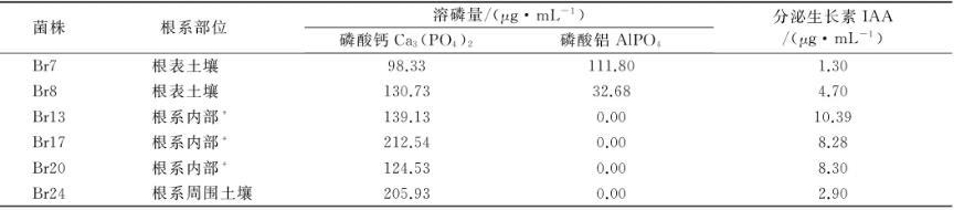 表1供試菌株溶磷量和分泌生長(zhǎng)素能力