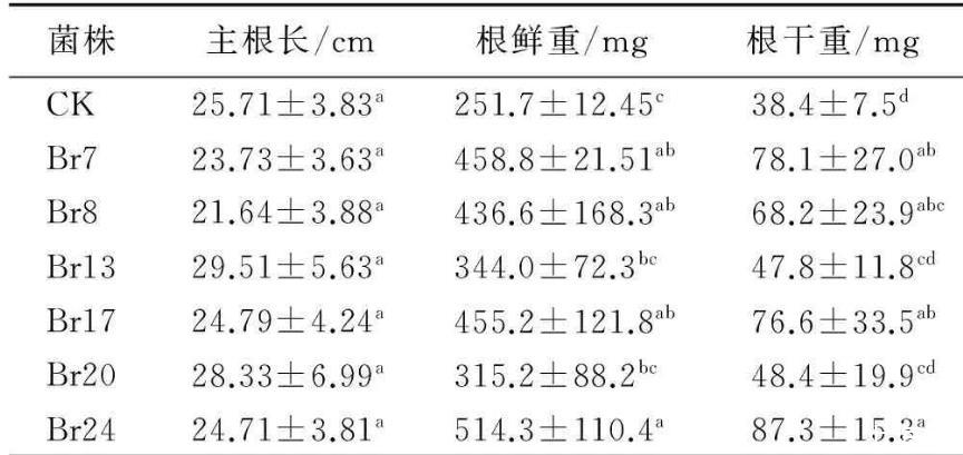 相對(duì)于各溶磷菌對(duì)株高的顯著促生作用,其對(duì)根系的促進(jìn)效果較弱。接種不同溶磷菌菌液的扁穗雀麥的根系長(zhǎng)度與對(duì)照差異不顯著(表2)。但植物根系的重量均比對(duì)照有增加趨勢(shì),除Br13與Br20外,其他處理均顯著高于對(duì)照(P<0.05),其中,Br24,Br7和Br17促生效果最好(P<0.01)。干重的變化趨勢(shì)與鮮重相同,Br3與Br20與對(duì)照差異不顯著(P>0.05),Br24、Br7、Br17與Br8均顯著高于對(duì)照(P<0.05)。
