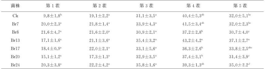 不同溶磷菌對(duì)植物的促生效果不同,在試驗(yàn)早期(第1茬),6種溶磷菌都能顯著促進(jìn)扁穗雀麥生長(zhǎng),其株高增加54.7%~120.7%(P<0.05)。第二茬與第三茬試驗(yàn)中,施用溶磷菌液的扁穗雀麥整體比對(duì)照要高,但相互之間差異不顯著(P>0.05)。而對(duì)第4茬與第5茬產(chǎn)量測(cè)定表明,除了Br13,施用其余溶磷菌液的扁穗雀麥的株高與對(duì)照沒(méi)有顯著差異(P>0.05),Br13在第5茬中顯著高于對(duì)照組(P<0.05)。從總體分析,篩選的溶磷菌屬于快生型溶磷菌種,對(duì)植物早期生長(zhǎng)的促生效果更明顯,其中Br24,Br13和Br73種溶磷菌的促生效果最好(表3)。