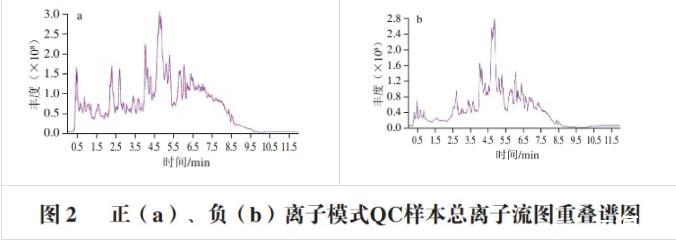 為評價儀器的穩(wěn)定性及數(shù)據(jù)質(zhì)量的可靠性,分別在正負離子模式下將QC樣本總離子流圖進行譜圖重疊比較,結(jié)果如圖2所示。結(jié)果表明兩種模式下各色譜峰的響應(yīng)強度和保留時間均基本重疊,說明在整個實驗過程中儀器誤差引起的變異較小,實驗結(jié)果較為可靠。