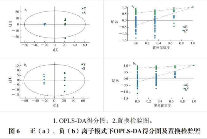 OPLS-DA得分圖及OPLS-DA置換檢驗(yàn)如圖6所示,t[1]能最大程度反映組間差異,而to[1]則反映組內(nèi)變異。可以看出OPLS-DA模型可顯著區(qū)分兩組樣本,且組內(nèi)差異較小,結(jié)果與PCA模型一致。經(jīng)7次循環(huán)交互驗(yàn)證得到模型評(píng)價(jià)參數(shù)R2Y、Q2,通常情況下Q2>0.5即表明模型穩(wěn)定可靠。該模型正、負(fù)離子模式下的Q2分別為0.998、0.999,均大于0.5。在置換檢驗(yàn)中,隨著置換保留度逐漸下降,隨機(jī)模型的R2和Q2均逐漸下降,說明原模型不存在過擬合現(xiàn)象,模型穩(wěn)定性良好。