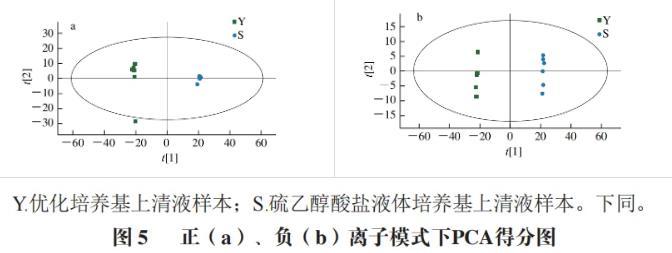 本研究結(jié)合單變量統(tǒng)計(jì)分析和多維統(tǒng)計(jì)分析方法,篩選Akk在兩種培養(yǎng)基中的顯著性差異代謝物,對(duì)正、負(fù)離子模式下檢測(cè)到的顯著性差異代謝物進(jìn)行分析。