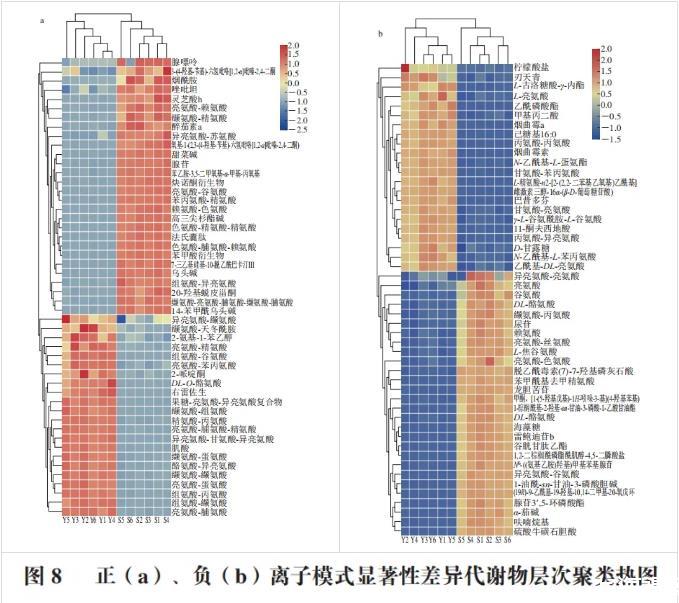 為了更全面直觀地顯示樣本之間的關(guān)系以及代謝物在不同樣本中的表達(dá)模式差異,將VIP值前50的顯著性差異代謝物用層次聚類進(jìn)行聚類分析,結(jié)果如圖8所示。聚在同一簇內(nèi)的代謝物具有相似的表達(dá)模式,可能具有相似的功能或者共同參與同一代謝過程或者細(xì)胞通路。