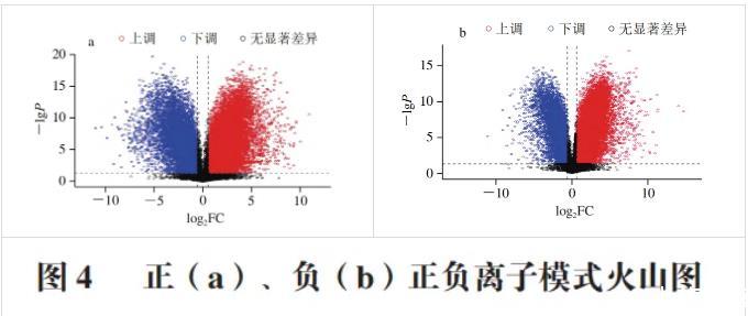 在進(jìn)行兩組樣本間的差異分析時(shí),常用的單變量統(tǒng)計(jì)分析方法包括差異倍數(shù)(FC)分析、T檢驗(yàn)/非參檢驗(yàn)?;趩巫兞糠治觯瑢?duì)正、負(fù)離子模式下檢測(cè)到的所有代謝物(含未被鑒定的代謝物)進(jìn)行差異分析,篩選出FC>1.5或FC<0.67,P<0.05的差異代謝物共902種,其中正離子模式下670種,負(fù)離子模式下232種。將這些差異代謝物用火山圖的形式表示,結(jié)果如圖4所示。
