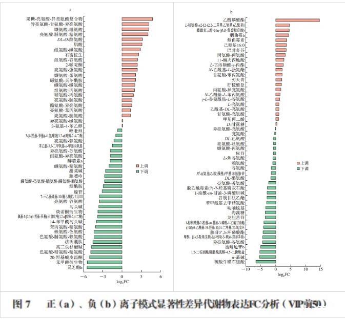 OPLS-DA模型得到的變量權(quán)重值(VIP)表示變量投影重要度,值越大,表示越重要。本實(shí)驗(yàn)以VIP>1和P<0.05為顯著性差異代謝物的篩選標(biāo)準(zhǔn),正離子模式下篩選到670種顯著性差異代謝物,負(fù)離子模式下篩選到232種顯著性差異代謝物,由于篩選到的差異代謝物過多,且表格無法直觀地顯示這些代謝物的FC,因此,選擇VIP值前50的差異代謝物,以柱狀圖形式展示鑒定到的顯著性差異代謝物的FC變化,結(jié)果如圖7所示。可以看出,與硫乙醇酸鹽液體培養(yǎng)基相比,Akk在優(yōu)化培養(yǎng)基中發(fā)酵后,正離子模式下22種代謝產(chǎn)物顯著上調(diào),28種代謝產(chǎn)物顯著下調(diào),負(fù)離子模式下顯著上調(diào)代謝產(chǎn)物22種,顯著下調(diào)代謝產(chǎn)物28種。后續(xù)將對(duì)這些顯著性差異代謝產(chǎn)物進(jìn)行分析。