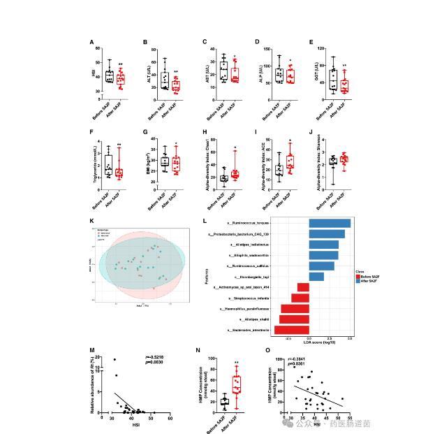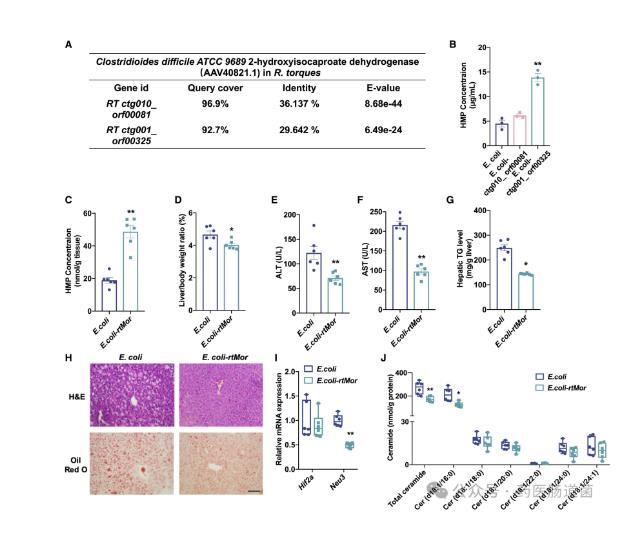 腸道微生物群和微生物代謝物是否有助于TRF對MASLD/MASH的影響仍有待探索。這項研究使用10小時TRF方案作為對MASLD患者和小鼠模型的干預(yù)措施,以探索TRF可以改善這種情況的潛在機制。發(fā)現(xiàn)10小時TRF后腸道菌群中的瘤胃球菌(R.torques)增加,該物種的定植足以模擬TRF對MASLD/MASH的有益影響。從機制上講,文章發(fā)現(xiàn)R.torques通過其微生物代謝產(chǎn)物2-羥基-4-甲基戊酸(HMP)抑制腸道HIF-2α-神經(jīng)酰胺軸來改善MASLD/MASH??偟膩碚f,這些結(jié)果確定了R.torques及其相關(guān)代謝物之一HMP在TRF對MASLD/MASH的有益作用中的作用,表明R.torques或HMP可能作為益生菌或作為MASLD/MASH的藥物治療開發(fā)。