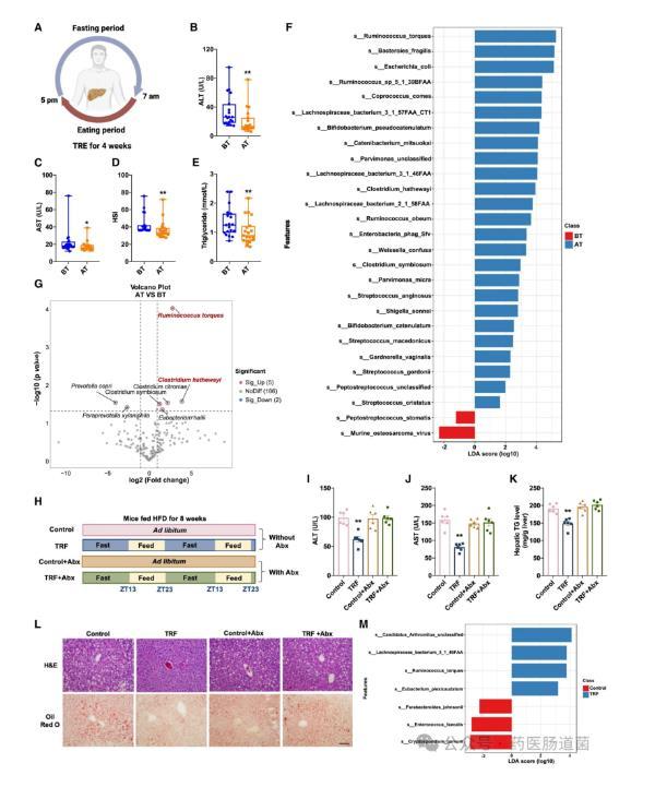 代謝功能障礙相關(guān)的脂肪變性肝?。∕ASLD)影響著四分之一的人口,對所有社會都構(gòu)成了重大的健康和經(jīng)濟負擔(dān)。MASLD包含多種肝臟表現(xiàn),從肝脂肪變性到更具侵襲性的代謝功能障礙相關(guān)脂肪性肝炎(MASH),后者以壞死炎癥和纖維化為特征,可進展為肝硬化和肝細胞癌(HCC)。減緩MASLD的進展,尤其是逆轉(zhuǎn)已建立的MASH,是臨床治療的重點。鑒于其復(fù)雜的病理學(xué)和目前缺乏批準(zhǔn)的醫(yī)療干預(yù)措施,積極的飲食和生活方式方法仍然是其管理的主要選擇,但由于依從性差而受到限制。調(diào)整飲食攝入量及進餐頻率和飲食時間窗口,已成為改善和延緩疾病發(fā)作和衰老的有力工具。限時喂養(yǎng)(TRF)需要在不限制熱量攝入的情況下將每日食物攝入限制在4至12小時的窗口內(nèi),被認為是一種有效的飲食和生活方式干預(yù)措施,可以改善和推遲疾病的發(fā)作。研究表明,TRF可以減輕體重,提高胰島素抵抗,抑制肝脂質(zhì)積累。然而,導(dǎo)致TRF益處的特定分子機制仍然難以捉摸。腸道菌群的組成是調(diào)節(jié)宿主代謝的關(guān)鍵因素。腸道微生物群的組成和功能容易受到飲食特征的影響,例如脂質(zhì)的數(shù)量和組成。食物過度消費、食物短缺,甚至飲食周期的變化都可能影響腸道菌群。TRF可以部分恢復(fù)小鼠高脂飲食(HFD)攝食引起的腸道菌群周期性波動,增加腸道菌群多樣性,影響宿主代謝,表明腸道微生物群可能在TRF的益處中發(fā)揮重要作用。微生物代謝物被認為是微生物群與宿主之間通信的關(guān)鍵介質(zhì),維持宿主的生理功能。