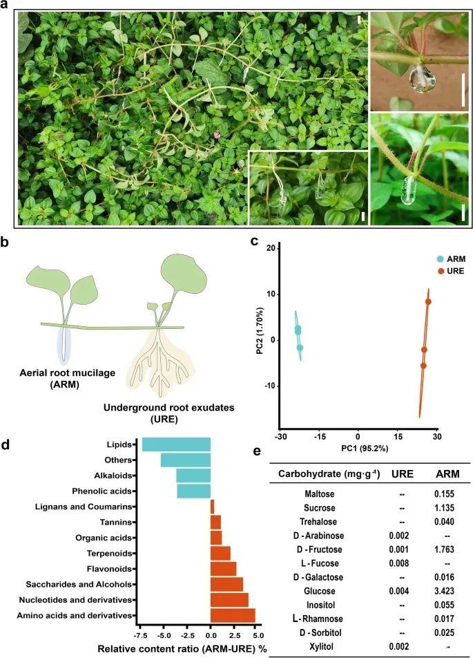 蔓性野牡丹(Heterotis rotundifolia)是一種快速生長(zhǎng)的多年生灌木雙子葉植物。它是全球雜草綱要中列出的高風(fēng)險(xiǎn)入侵植物之一。它們的氣生根從0.1到16 cm不等,在到達(dá)地面之前會(huì)散發(fā)出大量的黏液(圖示)。代謝物和微生物組分析表明,氣生根黏液富含碳水化合物和重氮營(yíng)養(yǎng)細(xì)菌。氮同位素標(biāo)記實(shí)驗(yàn)和基因表達(dá)分析表明,氣生根黏液微生物可以固定大氣氮以支持植物生長(zhǎng)。雖然氣生根黏液富含營(yíng)養(yǎng)物質(zhì),但沒(méi)有觀察到內(nèi)部富集其他環(huán)境和致病微生物。研究人員在黏液中鑒定出一種真菌分離物,該分離物已顯示出廣譜抗菌活性,但允許重氮營(yíng)養(yǎng)細(xì)菌的生長(zhǎng)。這種“友好”的真菌可能是維持黏液微生境中固氮功能的關(guān)鍵驅(qū)動(dòng)因素。