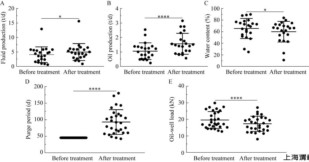 圖5微生物單井吞吐和油井清防蠟效果評價產(chǎn)液量(A)、產(chǎn)油量(B)和含水率(C)用于評估微生物單井吞吐效果,洗井周期(D)和油井載荷(E)用于評估清防蠟效果