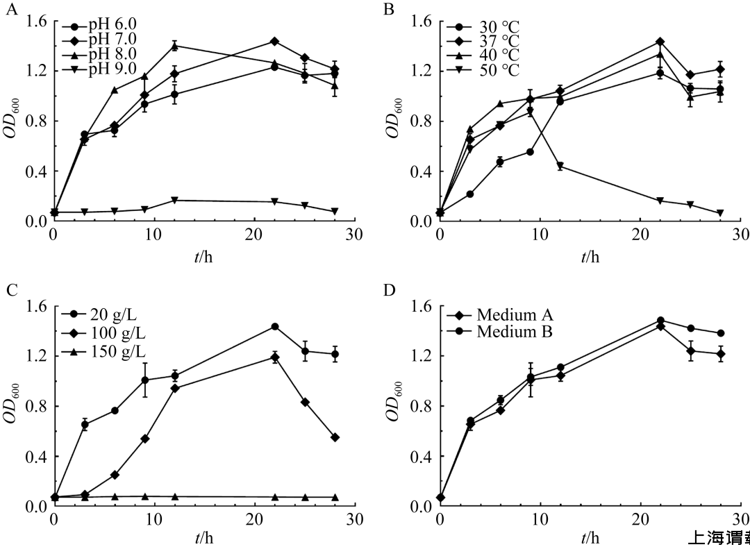 圖2菌株B6在不同環(huán)境下的生長曲線分析A:pH.B:溫度.C:礦化度.D:培養(yǎng)基對菌株B6生長的影響