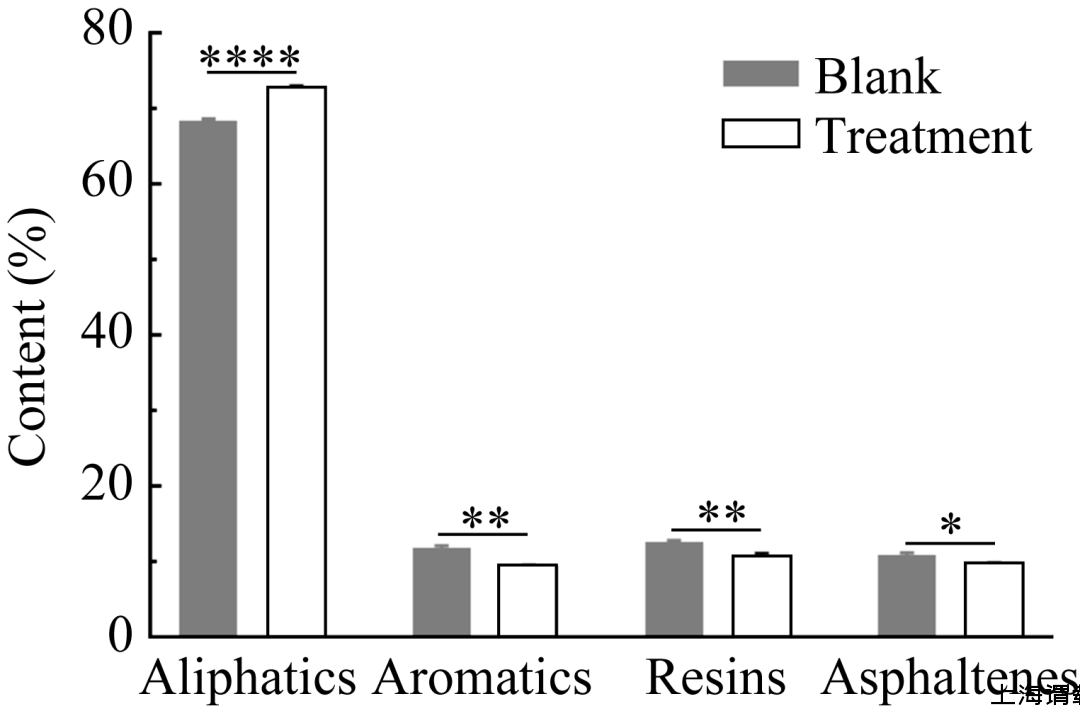 原油通常是一種化學成分復雜的黑色易燃液體,根據(jù)其在有機溶劑中的溶解度不同,可分為飽和烴、芳香烴、樹脂和瀝青質(zhì)。使用發(fā)酵培養(yǎng)基對菌株B6處理前后的原油進行四組分測試,各組分含量如圖3所示。經(jīng)菌株B6處理后,原油中的飽和烴含量顯著增加了4.38%(P<0.000 1),芳香烴、樹脂和瀝青質(zhì)含量減少,其中瀝青質(zhì)在處理前后含量差異不大(圖3)。這可能是該菌較強的乳化性能提高了細菌對疏水性烴類的可利用性,從而提高了長鏈或大分子多環(huán)烴的降解。此外,瀝青質(zhì)等大分子是原油高黏性和油井堵塞的主要原因,該菌在一定程度上能夠降解該類大分子物質(zhì)。因此,表明菌株B6能夠?qū)⒃椭械拇蠓肿又刭|(zhì)物質(zhì),如樹脂和瀝青質(zhì),降解成小分子輕質(zhì)石油基組分,增加了原油流動性,提高了原油的品質(zhì)。