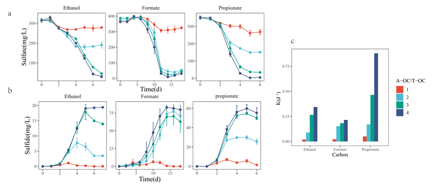 在理論碳源濃度下,硫酸鹽還原反應(yīng)基本不會(huì)發(fā)生。隨著碳源濃度的增加,硫酸鹽去除效率迅速增加。當(dāng)以乙醇和丙酸鹽為碳源時(shí),僅當(dāng)碳源量為理論值的3倍時(shí),硫酸鹽還原效率才達(dá)到85%以上。然而,當(dāng)使用甲酸鹽時(shí),碳源的量只需為理論值的兩倍。在乙醇和丙酸鹽理論濃度的兩倍下,硫酸鹽還原率分別為39.1%和56.9%。這是因?yàn)楫?dāng)乙醇和丙酸鹽被用作碳源時(shí),它們部分轉(zhuǎn)化為乙酸鹽,而乙酸鹽沒有被SRB作為電子供體充分利用,而甲酸鹽被充分利用乙酸鹽積累表明,盡管CO-SRB和IO-SRB共存,但I(xiàn)O-SRB顯然更容易生長(zhǎng)和增殖。