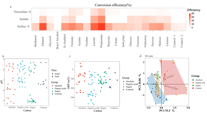 圖1不同碳源條件下反應(yīng)前后各項(xiàng)指標(biāo)的變化。A、硫化合物的轉(zhuǎn)化效率。b、反應(yīng)前后的pH值。C、反應(yīng)結(jié)束時(shí)的ORP值。d、PCA雙序列圖。