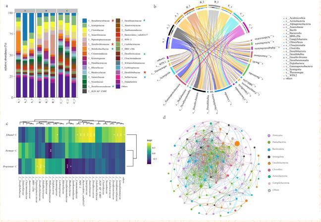 圖6微生物群落結(jié)構(gòu)分析。a,科級(jí)物種組成條形圖。b,類水平微生物物種組成的弦圖。c,科級(jí)物種與碳源的相關(guān)熱圖(*相關(guān),**顯著相關(guān),***高度相關(guān))。d,微生物繁殖網(wǎng)絡(luò)圖。(A、B、C分別代表乙醇、丙酸、甲酸;1、2、3代表濃度梯度)