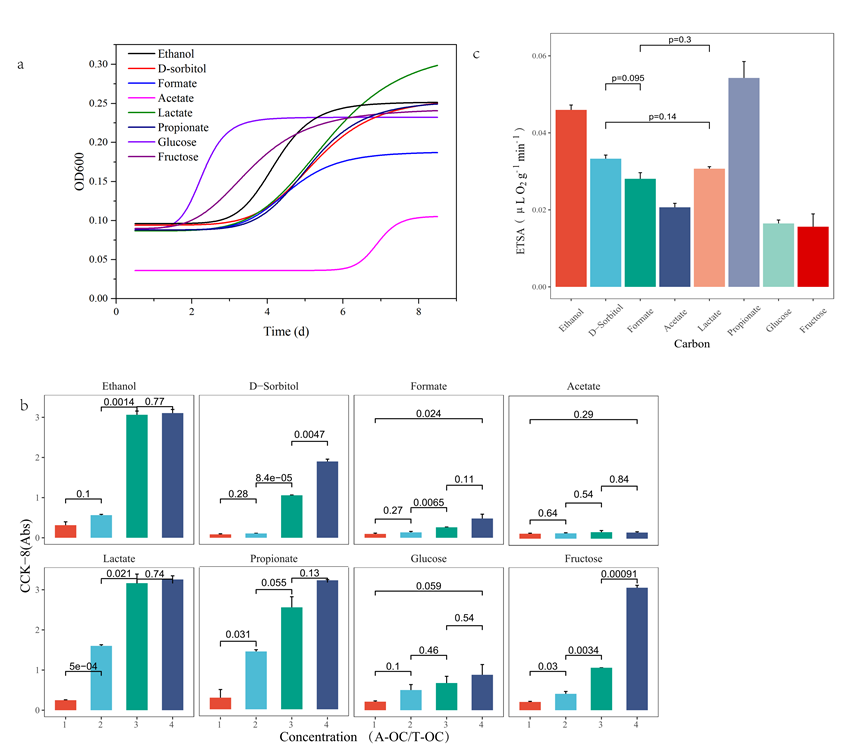 圖2微生物活性的變化。a,OD600表示的微生物生長(zhǎng)曲線(A-OC/T-OC=3)。b,CCK-8在不同碳源類型和濃度下檢測(cè)到的微生物數(shù)量。c,不同碳源條件下的ETSA(A-OC/T-OC=3)。