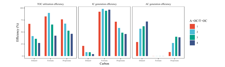 圖4不同碳源、不同碳源濃度條件下的碳源轉(zhuǎn)化(1、2、3、4對(duì)應(yīng)A-OC/TO-OC比值)。