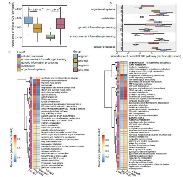 在細(xì)菌和古菌中,較小的基因組規(guī)模往往與較低的功能基因豐度有關(guān)。平均而言,pos-arch組中的類群的KOs和KEGG通路的豐度明顯高于neg-arch組中的類群,而細(xì)菌中的情況恰恰相反。只有一個(gè)例外,即遺傳信息處理通路在pos-bac組和neg-bac組之間沒有顯著差異。