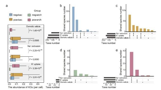 與鹽敏感類群相比,耐鹽細(xì)菌和古菌與耐鹽相關(guān)的KO的豐度都明顯更高。這證明了分組的準(zhǔn)確性。與豐度不同,細(xì)菌和古細(xì)菌之間的耐鹽機(jī)制多樣性也存在很大差異。耐鹽古細(xì)菌往往具有全面的耐鹽機(jī)制。對(duì)于三種最著名的適應(yīng)性抗鹽機(jī)制,76%的耐鹽古細(xì)菌(38個(gè)類群)擁有這三種抗鹽機(jī)制,而只有2%的敏感古細(xì)菌(10個(gè)類群)擁有這三種機(jī)制。細(xì)菌類群則呈現(xiàn)出相反的模式。也就是說,pos-bac類群的耐鹽機(jī)制多樣性較低。