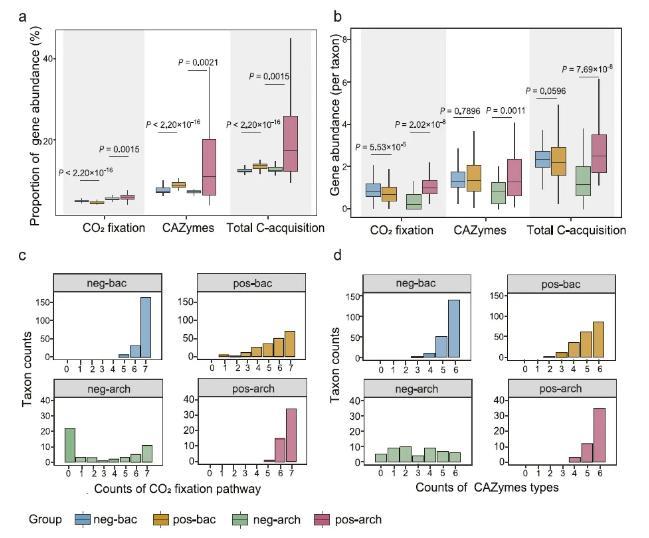 與鹽敏感細(xì)菌和古菌相比,耐鹽細(xì)菌和古菌往往含有較高比例的C獲取基因。具體來說,pos-bac組的總碳獲取基因和碳降解基因的相對(duì)豐度為13.49%,而negative-bac組為12.43%。這種模式在古菌中更為明顯,正古細(xì)菌與負(fù)古菌的總碳獲取基因比率分別為24.37%與12.65%。pos-arch組和neg-arch組中參與C獲取的基因絕對(duì)豐度沒有明顯差異。就古細(xì)菌而言,pos-arch組參與C獲取的基因絕對(duì)豐度明顯高于負(fù)-古細(xì)菌。