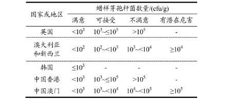 表1國(guó)內(nèi)外即食食品中蠟樣芽孢桿菌限量要求