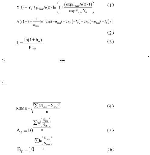 式中:t為時(shí)間,h;Y(t)為t時(shí)的菌數(shù),cfu/g;Y0為初始菌數(shù),cfu/g;Y max為最大菌數(shù),cfu/g;μmax為最大比生長(zhǎng)速率;λ表示遲滯時(shí)間,h;h0表示初始時(shí)細(xì)胞的生理狀態(tài)。