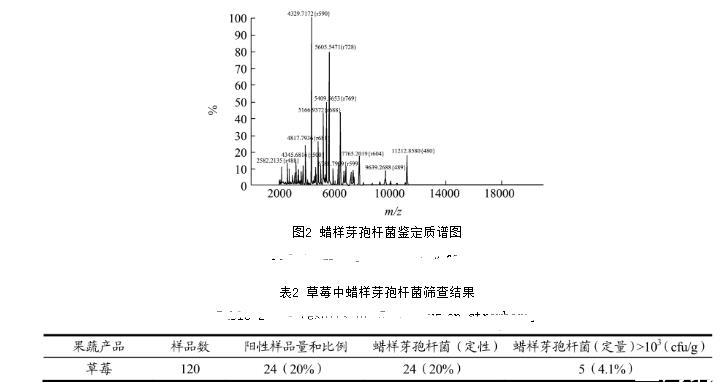 圖2蠟樣芽孢桿菌鑒定質(zhì)譜圖 表2草莓中蠟樣芽孢桿菌篩查結(jié)果