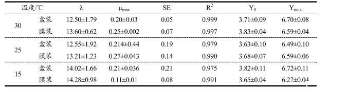 如表3所示,建立模型的回歸系數(shù)(R2)在0.972~0.999,標(biāo)準(zhǔn)誤差(SE)在0.05~0.21間,說(shuō)明此模型對(duì)實(shí)驗(yàn)數(shù)據(jù)的擬合度較好。膜裝草莓的微生物的回歸系數(shù)較高,標(biāo)準(zhǔn)誤差也較盒裝的低,可能因?yàn)槟ぱb較盒裝透氣性較差,草莓呼吸作用產(chǎn)生的水分沒(méi)有被空氣流通帶走,水分活度保持一個(gè)很高的水平,且相對(duì)環(huán)境較封閉,其生長(zhǎng)曲線擬合后更符合Baranyi的數(shù)學(xué)模型。
