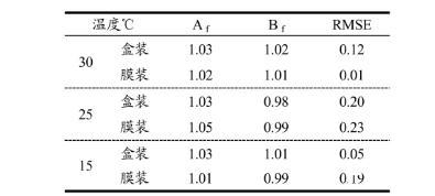 Af代表了每一個(gè)預(yù)測(cè)值的點(diǎn)與等值線之間的平均距離,可以衡量預(yù)測(cè)值和觀測(cè)值之間的接近程度,本實(shí)驗(yàn)中Af分布在1.01~1.05之間,表示模型的穩(wěn)定性較高,B f用來(lái)判斷預(yù)測(cè)值在等值線的上方還是下方以及評(píng)價(jià)預(yù)測(cè)值偏離等值線的程度,本實(shí)驗(yàn)中Bf分布在0.98~1.02之間,當(dāng)Bf>1說(shuō)明該模型為有效保護(hù)模型,在25℃,建立模型為保護(hù)性模型,30℃是預(yù)測(cè)偏差向下,但總體偏差較小。RMSE值一般用來(lái)驗(yàn)證預(yù)測(cè)模型的離散程度,實(shí)驗(yàn)中RMSE在0.01~0.23表明實(shí)測(cè)數(shù)據(jù)和預(yù)測(cè)模型數(shù)據(jù)離散程度相對(duì)較小,整體體現(xiàn)模型可接受。