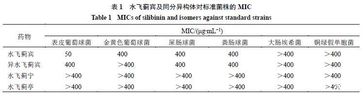 結(jié)果見表1。水飛薊賓對革蘭陽性菌標準菌株的MIC為50~400μg/mL,對表皮葡萄球菌表現(xiàn)出最強的抑菌活性,MIC值為50μg/mL。水飛薊賓對革蘭陰性菌標準菌株的抑菌效果明顯低于革蘭陽性菌,MIC值>400μg/mL;在水飛薊賓的同分異構(gòu)體中,僅異水飛薊賓表現(xiàn)出對表皮葡萄球菌、屎腸球菌和糞腸球菌標準菌株有一定的抑菌活性(MIC為400μg/mL)。水飛薊賓的抑菌活性明顯高于其同分異構(gòu)體。