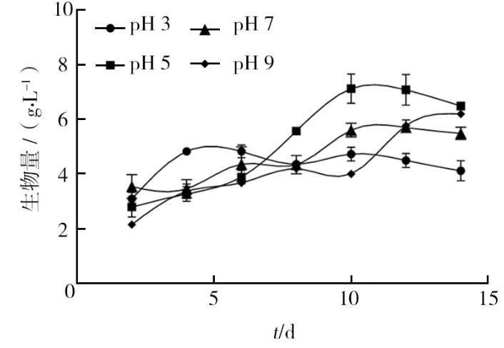 圖2不同pH條件對血紅密孔菌培養(yǎng)過程中生物量的影響