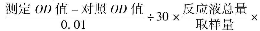 1.2.4總抗氧化能力檢測采用南京建成生物工程研究所試劑盒測定,具體操作步驟按試劑盒說明書進行。待測樣品分為測定管與對照管,測定管中依次加入相關試劑及待測樣品;對照管中除不加入待測樣品外,其余同測定管一致。37℃充分反應30 min后,各加入顯色劑(對照管中另加入待測樣品)分別充分混勻;于520 nm波長下,測定各管吸光度值??偪寡趸芰τ嬎愎剑?