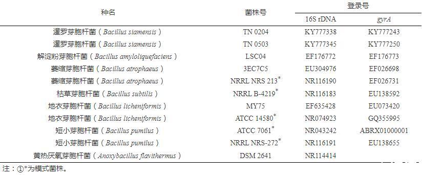 (3)16S rDNA、gyrA序列擴增及系統(tǒng)發(fā)育分析:使用BioTeke細菌基因組DNA提取試劑盒(北京百泰克生物技術(shù)有限公司),提取拮抗菌株DNA。利用細菌通用引物16S rDNA及gyrA對提取的細菌DNA進行PCR擴增后,采用1.0%(質(zhì)量分?jǐn)?shù))瓊脂糖凝膠進行電泳檢測,PCR擴增產(chǎn)物送生工生物工程(北京)股份有限公司測序。測序結(jié)果修正后經(jīng)NCBI進行BLAST初步比對,根據(jù)比對結(jié)果下載親緣關(guān)系較近的序列及模式菌株(表1),在BioEdit 7.0軟件上對各菌株的序列進行修正后,以黃熱厭氧芽胞桿菌(Anoxybacillus flavithermus)為外群,使用MEGA 5.0軟件并采用最大似然法(Maximum Likelihood,ML)構(gòu)建多基因系統(tǒng)發(fā)育樹。