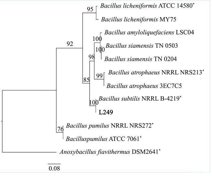 基于16S rDNA和gyrA基因序列構(gòu)建了菌株L249的多基因系統(tǒng)發(fā)育樹(圖5),結(jié)果顯示菌株L249與枯草芽胞桿菌(Bacillus subtilis NRRL B-4219*)聚為一支,且支持率為100%,結(jié)合其形態(tài)特征、生理生化特性及系統(tǒng)發(fā)育分析,將其鑒定為枯草芽胞桿菌(Bacillus subtilis)。菌株L249的16S rDNA和gyrA基因序列已提交GenBank數(shù)據(jù)庫,登錄號分別為MT786346和MT802123。