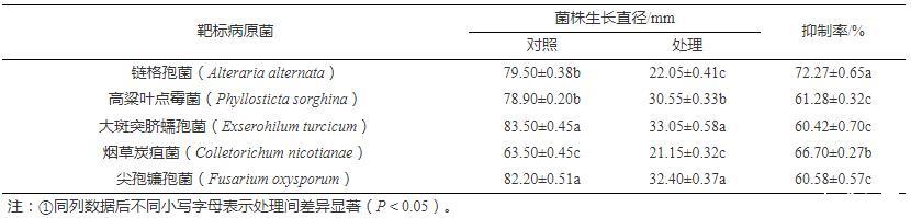 從采集的土壤中分離純化后共獲得96株芽胞桿菌,通過對峙培養(yǎng)篩選到1株具有較好拮抗作用的菌株(圖1),編號為L249。該菌對5種植物病原真菌均具有良好抑制作用,抑制率均在60.00%以上(表2),其中對鏈格孢菌的抑制效果最好,抑制率達72.27%。
