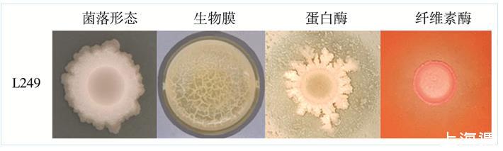 圖4菌株L249菌落形態(tài)、生物膜、蛋白酶和纖維素酶檢測