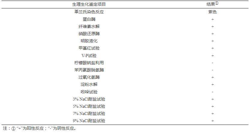菌落形態(tài)觀察發(fā)現(xiàn)(圖4),菌株L249在LB培養(yǎng)基平板上呈乳白色,菌落表面有褶皺,邊緣不整齊。菌株的生理生化特征如表3所示,菌株L249革蘭氏染色為紫色,能產(chǎn)生多種水解酶,明膠液化、甲基紅試驗及V-P試驗等反應(yīng)均呈陽性,檸檬酸鈉鹽利用、苯丙氨酸脫氫酶和吲哚試驗等反應(yīng)均呈陰性且具有較好的耐鹽性。