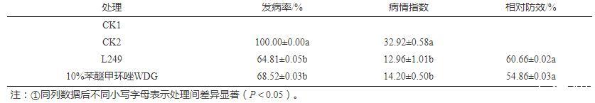 盆栽試驗結(jié)果表明(表4),L249發(fā)酵液對煙草赤星病具有明顯防治效果,經(jīng)其處理后煙株發(fā)病率和病情指數(shù)均顯著低于對照,相對防效為60.66%,與10%苯醚甲環(huán)唑WDG的相對防效無顯著差異。